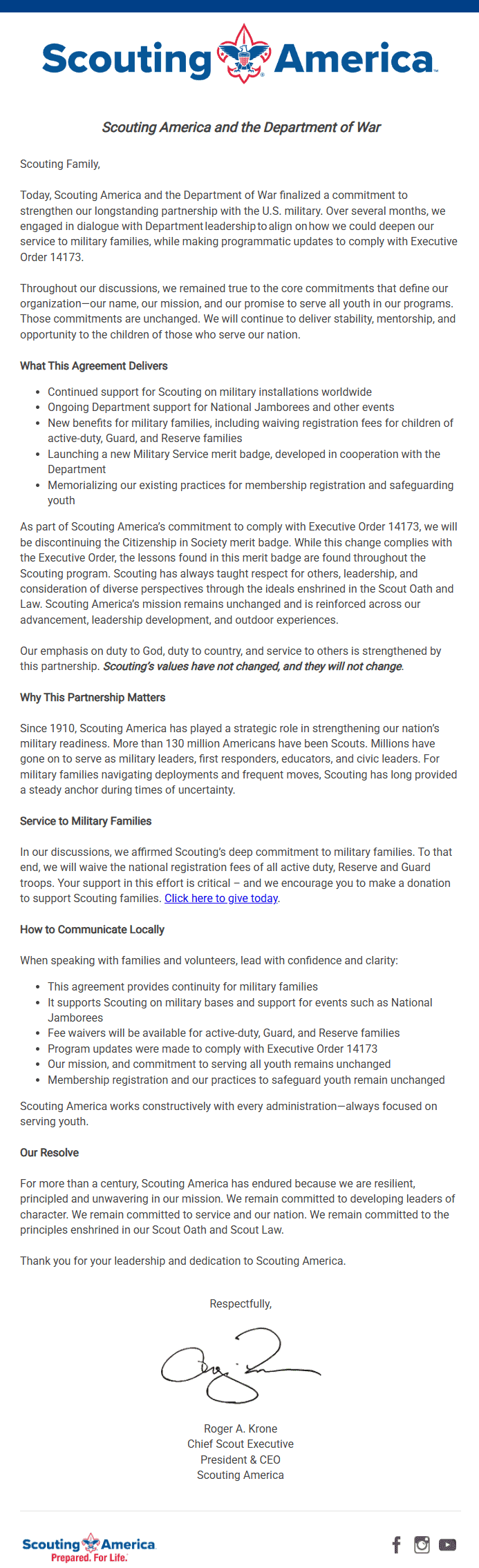 In exchange for these programmatic changes, the Department of War agreed to continue its longstanding support for Scouting on military installations, at National Jamborees, and through other events.